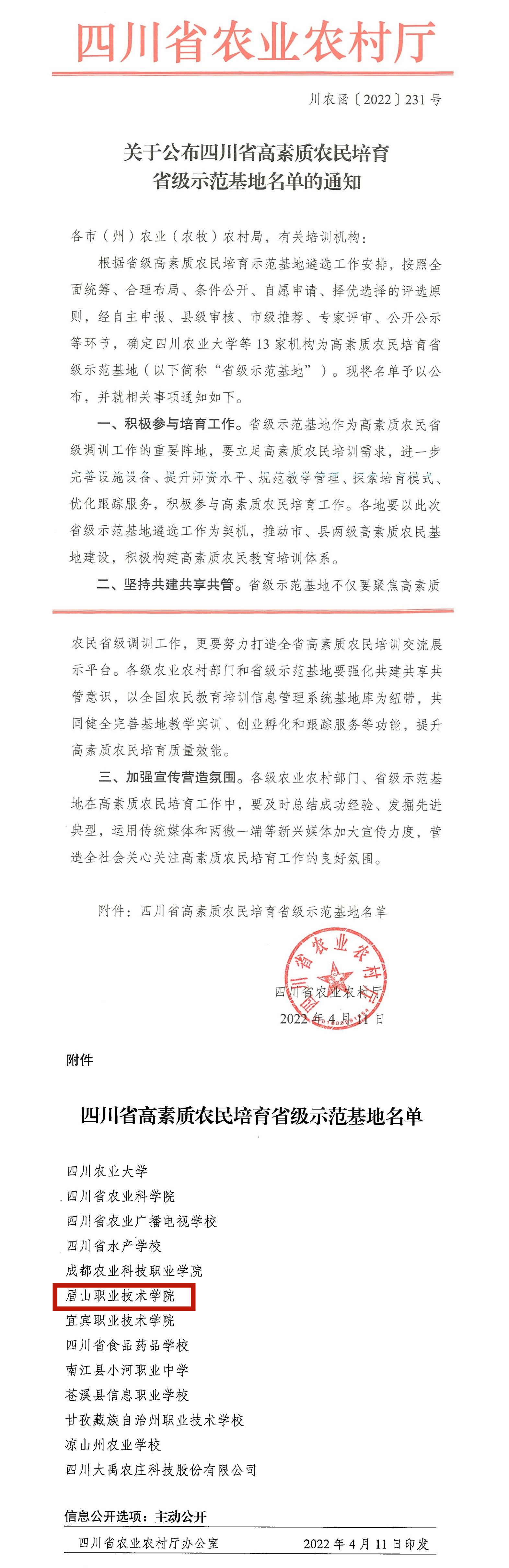 4月11日,四川省农业农村厅公布了省级高素质农民培育示范基地名单,我校成功入选。