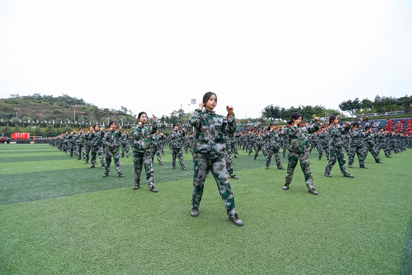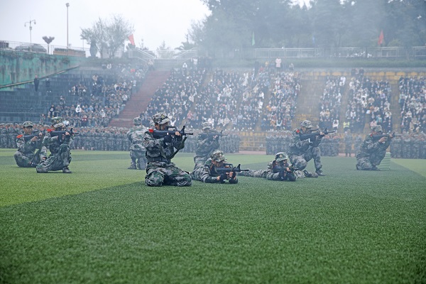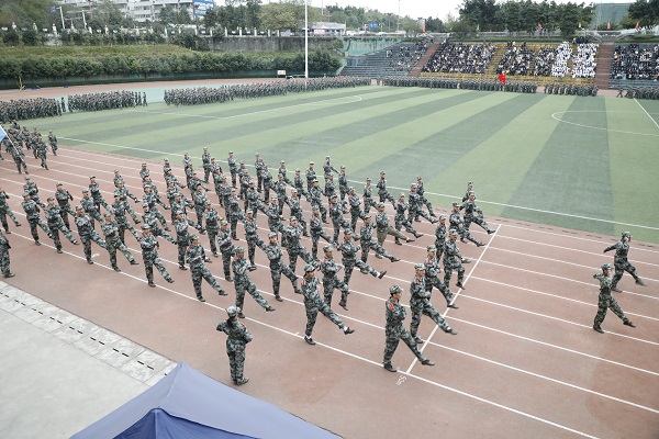 分列式表演后,各连队展示了花式队列、擒敌拳、战术方阵等团体表演,精彩的表演赢得现场师生阵阵掌声。