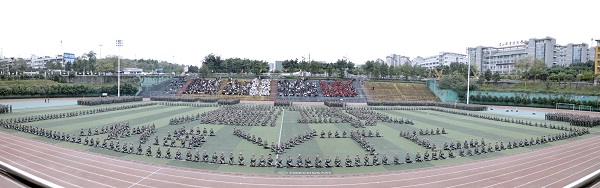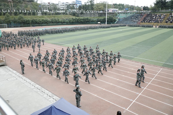 新生们身穿整齐的军训服装,站着标准的军姿,昂首挺胸,目光如炬,朝气蓬勃,等待着主席台的检阅。在迎国旗后,新生们在中国人民解放军进行曲中拉开了军事技能课汇报表演帷幕,35个方队依次经过主席台,无论是矫健男儿,还是铿锵玫瑰,他们步伐整齐、神采奕奕、声音响亮,口号更是别出心裁,体现了学生们青春激扬、创新求彩的精神面貌。