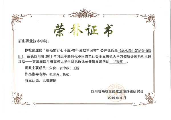 学生作品《绿水青山就是金山银山》获2019年第三届四川省高校大学生讲思政课活动三等奖;