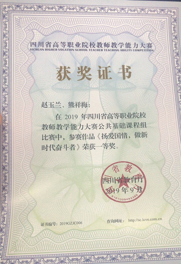 2018年、2019年思政教学部教师赵玉兰、熊祥梅参加四川省教师教学能力大赛荣获一等奖;