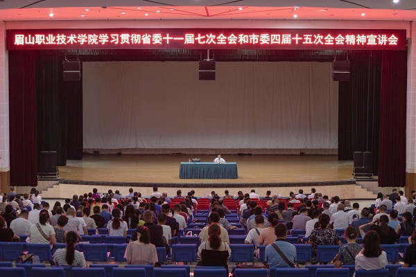 近日,眉山职业技术学院在艺术中心召开全校教职工大会,专题学习传达省委十一届七次全会、市委四届十五次全会精神。学校党委书记代贤军进行宣讲,并对学习宣传贯彻落实会议精神进行安排部署。