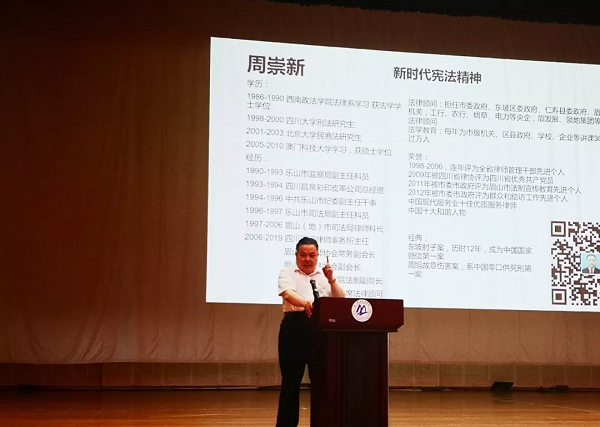 推进会后,眉山洪运律师事务所主任周崇新就新时代主题、宪法主要内容和宪法精神开展了深入浅出和精彩的宣讲报告。
