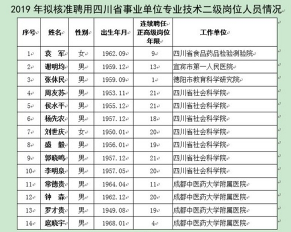 6月12日,记者从省人社厅了解到,根据《四川省事业单位专业技术二级岗位管理办法》的规定,经个人申请,事业单位初审,主管部门复核,省人社厅组织终审,省人社厅拟核准袁军等244人聘用我省事业单位专业技术二级岗位。目前,这244人正在进行为期5个工作日的公示期。干部群众若有情况需要反映的,请于公示期内以真实姓名向省专家服务中心反映。