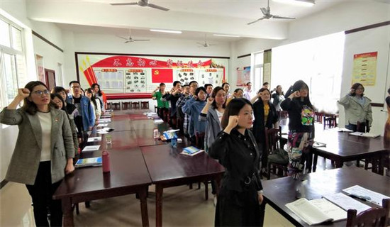 最后,廖敏向全体党员发出了担当作为的动员令、集结号:坚持用习近平新时代中国特色社会主义思想武装头脑,强化“三个担当”,做到“三个带头”,喊响“向我看齐”,发挥“带头冲”“领着干”的榜样和标杆作用,以行动兑现承诺,争做干事创业奋发有为的党员教师。