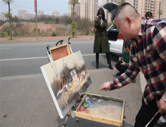 樱花园中,教师们发挥所长,拿起画笔、相机、摄影机采集素材,现场创作,可谓是:“人在景中,景在画中”。资深教师、著名画家袁泉现场创作了一幅油画作品,并就油画创作中的取景、情感表达与青年教师们作了分享。