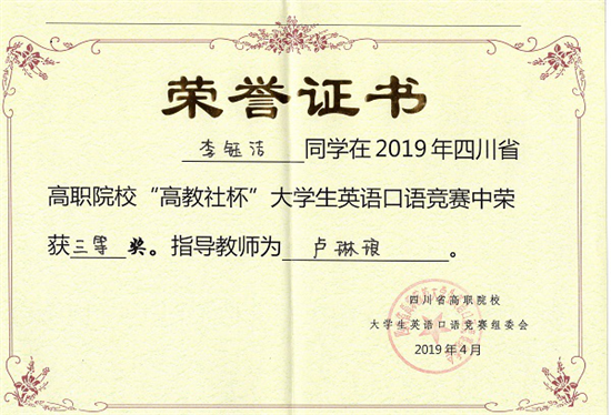 四川新闻网眉山4月9日讯(吕伟利)由四川省教育厅主办,四川省高等教育学会高校外语教学研究会和高等教育出版社协办,成都纺织高等专科学校承办的2019年四川省高职院校大学生英语口语技能大赛于4月4日在成都举行,来自全省62所高职院校的60多名选手经过激烈角逐,最终眉山职业技术学院文化艺术系英语教育专业学生李钰洁获得三等奖。