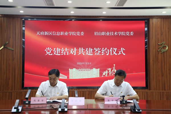 7月5日,眉山职业技术学院与天府新区信息职业学院举行党建结对共建签约仪式。眉山职业技术学院党委书记代贤军,天府新区信息职业学院党委书记景志明出席仪式。