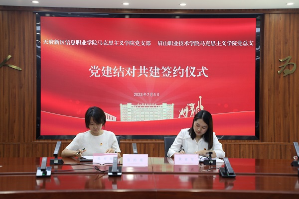 眉山职业技术学院党委与天府新区信息职业学院党委、眉山职业技术学院马克思主义学院(思政教学部)一党支部与天府新区信息职业学院马克思主义学院党支部分别签订了《党建结对共建协议书》,双方围绕“党建引领聚合力,结对共建促发展”主题开展党建结对共建,共建内容包括经验共享、队伍共育、课程共济、活动共生、发展共谋。