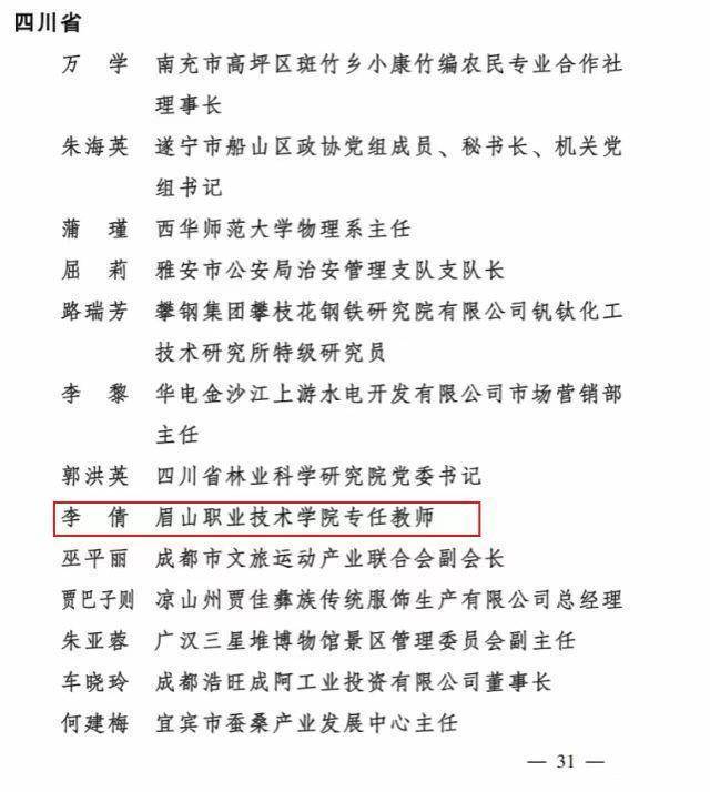 全国妇联评选出10名全国三八红旗手标兵、596名全国三八红旗手、395个全国三八红旗集体、599个全国巾帼文明岗。眉山职业技术学院教师李倩荣获全国三八红旗手,四川省眉山市东坡农技推广科技小院获评全国巾帼文明岗。