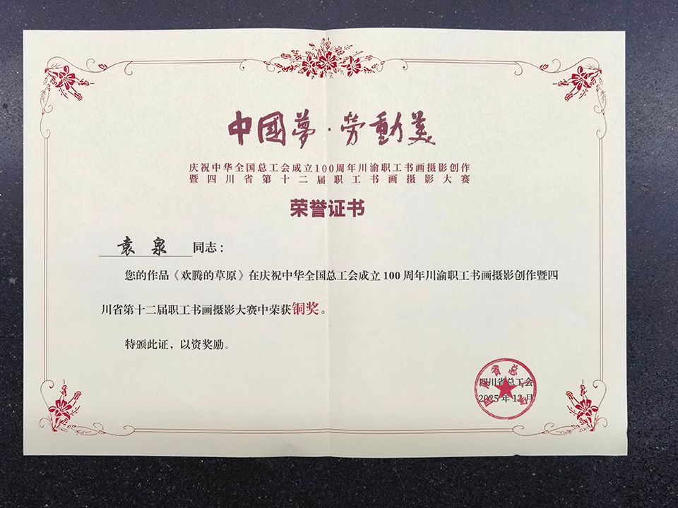12月3日,由四川省总工会主办、四川省经济文化协会承办的“中国梦·劳动美—奋斗百年路 起航新征程”庆祝中华全国总工会成立100周年书画摄影采风创作展暨四川省第十二届职工书画摄影大赛结果揭晓。我校教育与文化传媒学院教授袁泉的美术作品《欢腾的草原》凭借深厚的艺术造诣与鲜明的时代内涵,荣获铜奖。
