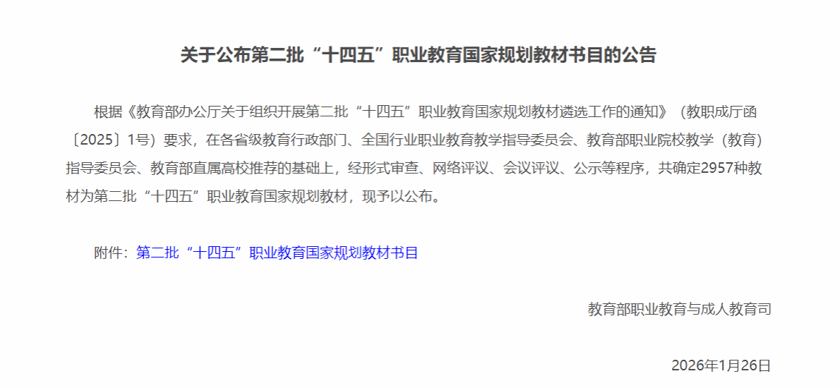 1月26日,教育部职业教育与成人教育司公布了第二批“十四五”职业教育国家规划教材书目,我校三部教材成功入选。