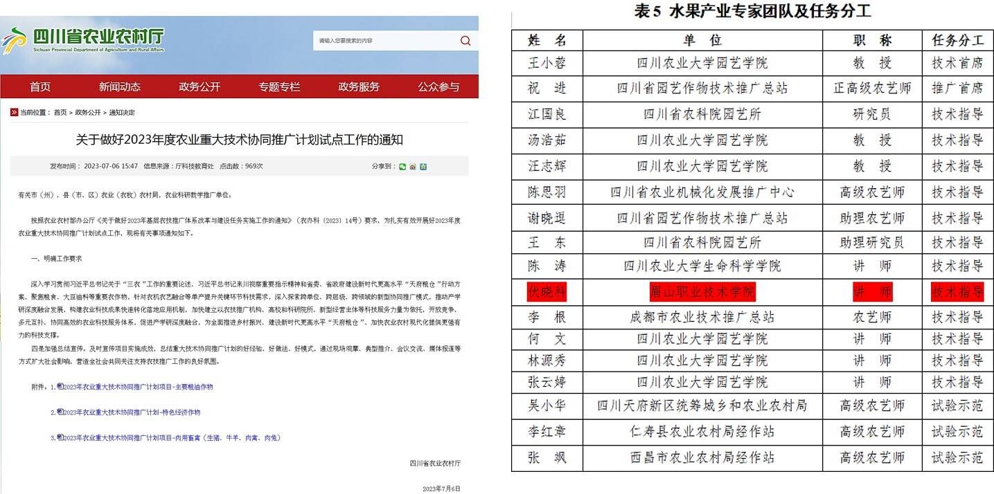 近日,四川省农业农村厅下发《关于做好2023年度农业重大技术协同推广计划试点工作的通知》,我校农业技术系教师伏晓科作为水果产业专家入选“2023年农业重大技术协同推广计划-特色经济作物”团队。