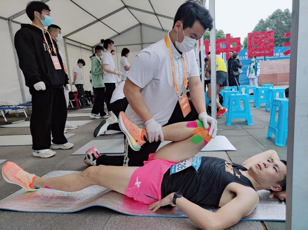 同学们发挥自己的专业特长与优势,针对运动员赛后产生的肌肉酸痛与疲劳症状,运用专业拉伸与按摩等手段,使参赛运动员紧张的肌肉与疲劳得到放松,减缓酸疼。娴熟的技能与细致的服务,赢得了赛事组委会和运动员的高度认可。