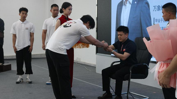 仪式上,罗树明向6位企业导师颁发了聘书,学徒向企业导师敬茶、献花、拜师。企业导师为学徒们发放了乾坤乐健现代学徒制定制服装。
