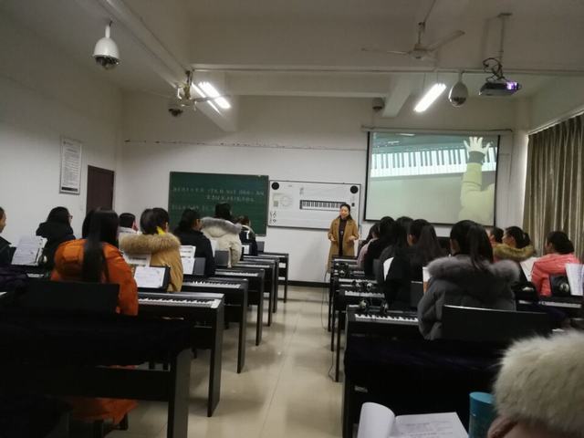 2017年12月27日(星期三)第2节课,师范教育系周庆媚老师在艺术中心111教室上了教改公开课,教学课题为《钢琴基础》课程中的“跳音弹奏——四川民歌《数蛤蟆》”。本次课以下几点做得较好:1、教学设计清晰。文本中教学目标设定准确,重难点清楚,通过检查学生课前弹奏视频,引导学生在比较中发现弹奏问题,通过整体弹奏、个别弹奏、接龙弹奏等形式提升歌曲弹奏技能,教学活动具体、层次清楚,教学环节完整。2、导入恰当,营造轻松愉快的音乐氛围。课程以《数蛤蟆》歌曲导入新课,让学生跟拍跟唱,让学生从对比中找出弹奏问题,提高学生学习参与性,培养音乐情绪; 3、练习形式多样,技能目标的达成较好。教师的讲解示范较深入到位,课堂教学形式多样,能够敏锐的捕捉学生弹奏过程中存在的问题,重点强调弹奏情绪和弹奏力度,学生学习情绪饱满,参与度较好,弹奏要领及技能的掌握较好。建议:以讲练结合方式逐个落实弹奏五要领,教学效率应更好,如果把《数蛤蟆》歌曲文化背景与弹奏技能相结合,将有利于学生把握歌曲思想与情感,学生的弹奏会由内向外散发出一定的表现力。