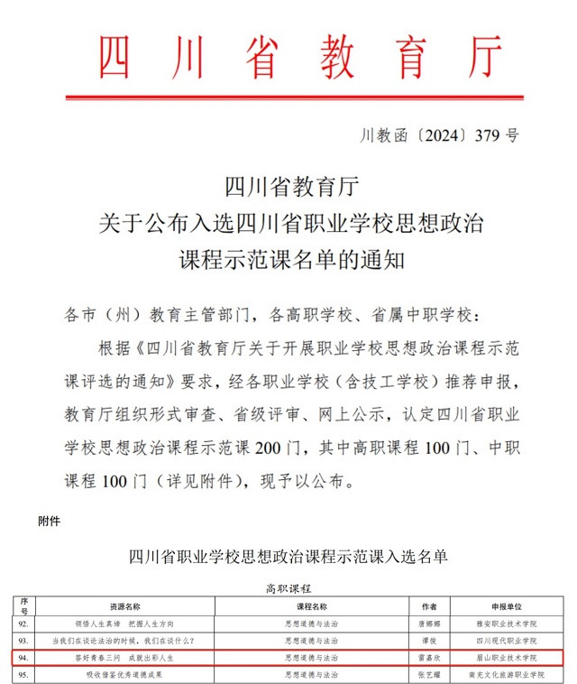 近日,马克思主义学院教师雷嘉欣主持的思想道德与法治课程作品《答好青春三问 成就出彩人生》成功入选四川省教育厅公布四川省职业学校思想政治课程示范课名单。