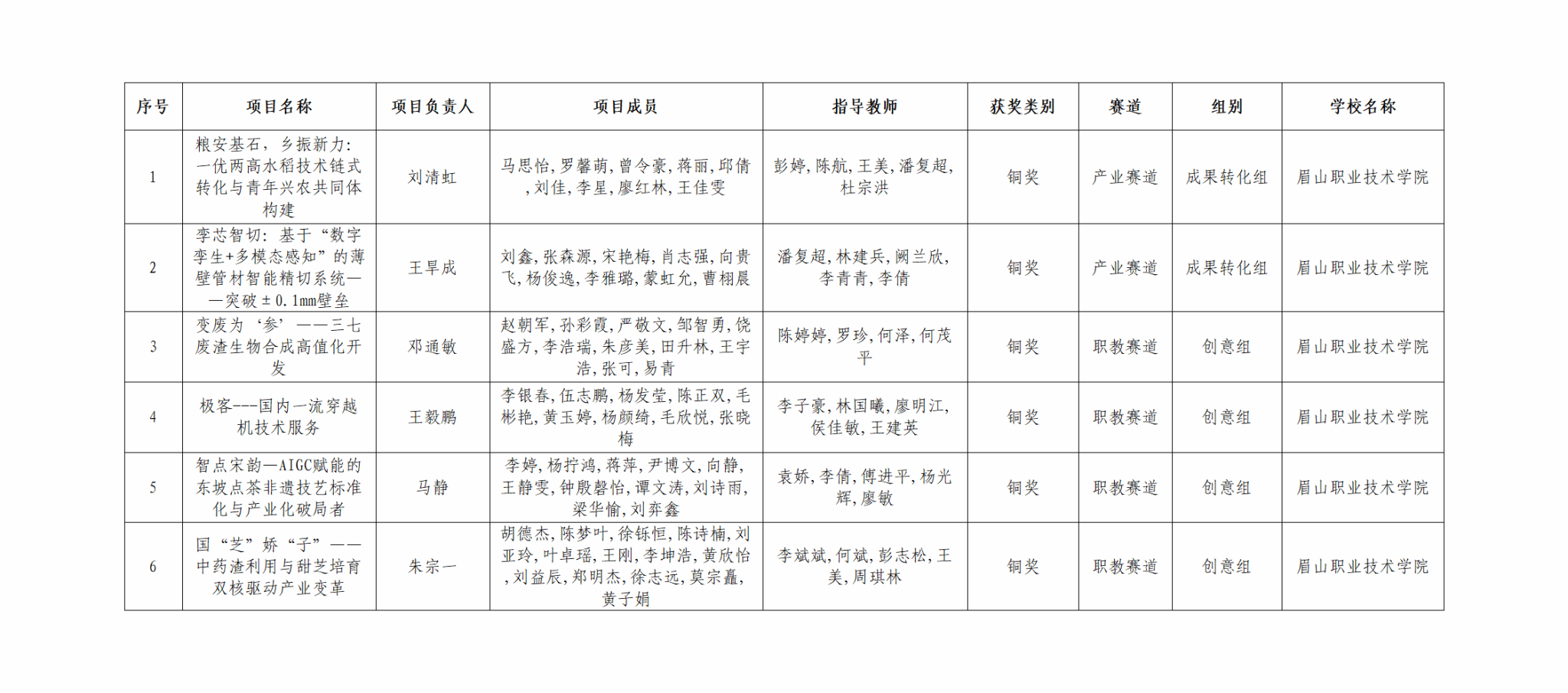 近日,四川省教育厅公布了2025年四川省国际大学生创新大赛获奖名单。我校选送的6个项目全部获奖,斩获职教赛道铜奖4项、产业赛道铜奖2项,获奖数量创历史新高。