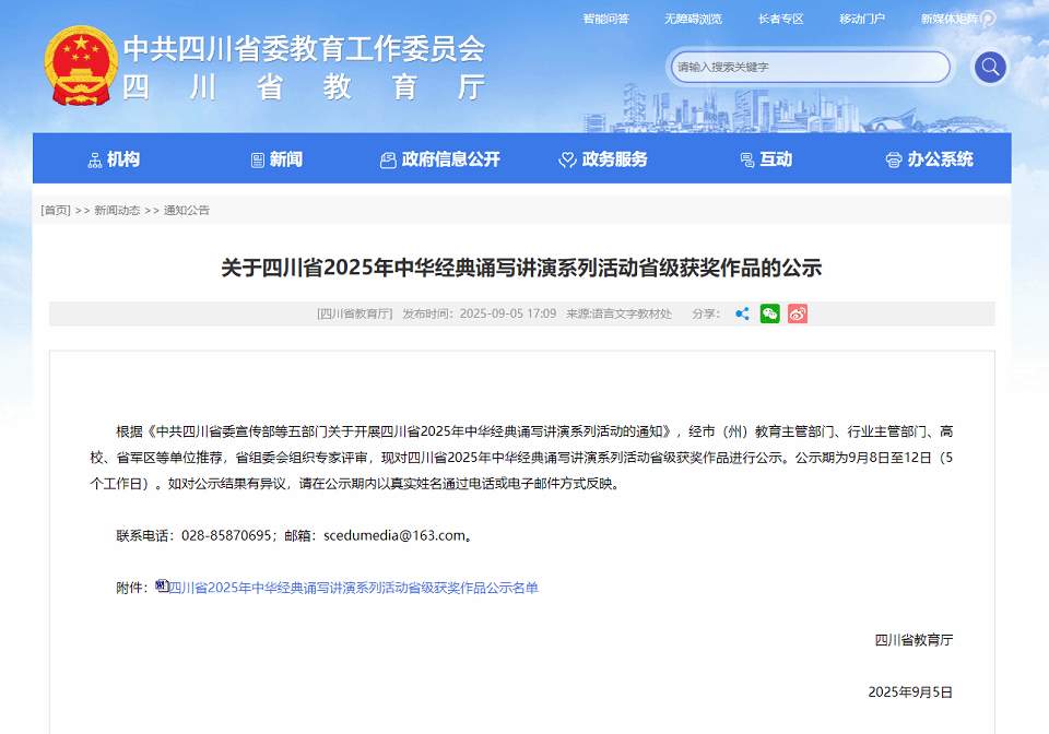 近日,由四川省委宣传部、省委教育工委、教育厅、省文明办、省语委共同主办的四川省2025年中华经典诵写讲演系列活动圆满落下帷幕。我校选送的15件参赛作品,荣获一等奖7项、三等奖4项、优秀奖4项。