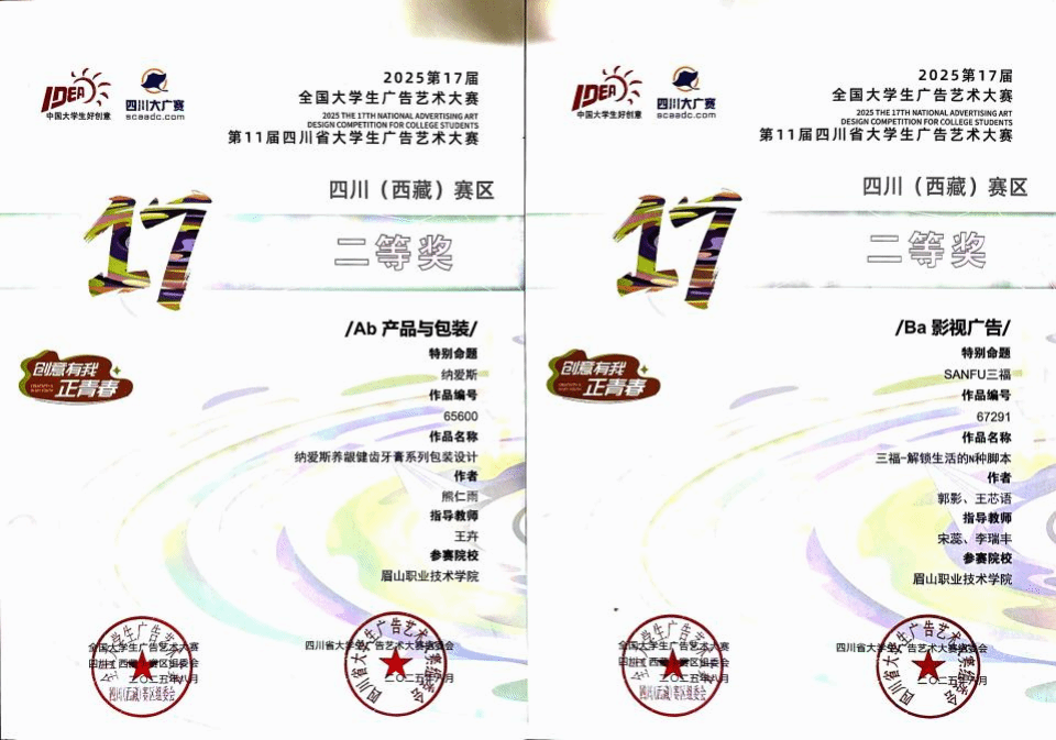近日,由四川省教育厅主办的第十一届四川省大学生广告艺术大赛圆满落幕。我校教育与文化传媒学院文创专业集群学子凭借扎实的专业功底与突破性创新思维脱颖而出,在赛事改革、竞争白热化的背景下斩获颇丰,共揽获一等奖2项、二等奖4项、三等奖7项。