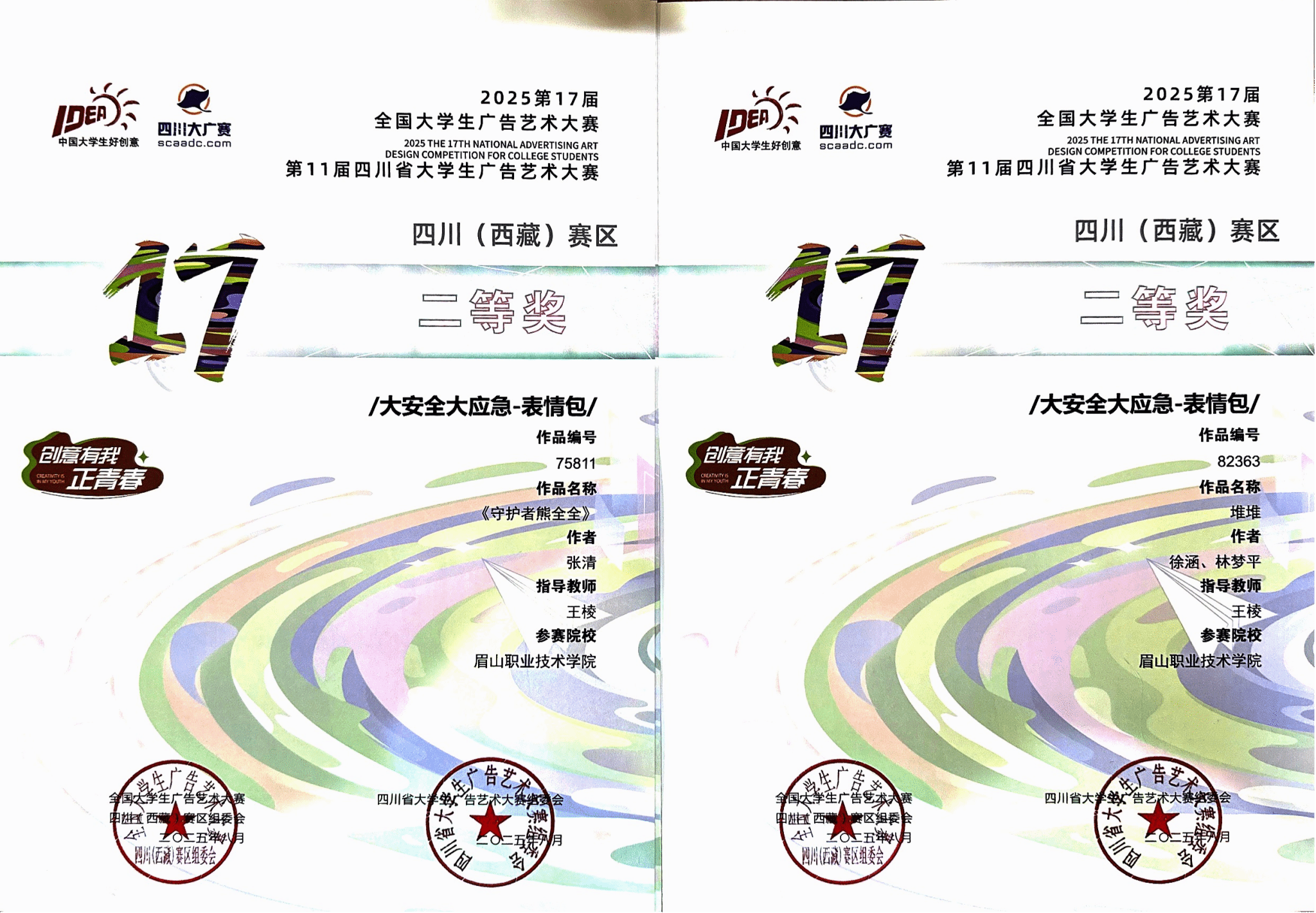 本届大赛迎来重要机制革新,相较往年取消优秀奖设置,仅保留等级奖项,大幅提升了获奖门槛与竞争激烈程度。在高标准、高压力的赛事环境中,我校学子在教育与文化传媒学院王棱、李瑞丰、宋蕊、王卉四位教师的精心指导下,精准把握赛事导向,深耕创作细节,展现出强劲的专业竞争力。其中,蒋婷婷、刘欣雨、柏婉欣团队的《扭出新世界》、郭容菲与古小芳的《星安e消防工作日常》凭借独特创意与精良呈现斩获一等奖;张清的《守护者熊全全》、徐酒与林梦平的《堆堆》、熊仁雨的《纳爱斯养龈健齿牙膏系列包装设计》、郭影与王芯语的《三福—解锁生活的W种脚本》荣获二等奖;吴静的《矿山小精灵“矿啾啾”》、屈佳莹与李靓的《火扑扑表情包》、张馨月与唐悦的《草本色彩交响曲》、王媛与杨佳欣的《摊面与纳爱斯》、蔡东伯与李仁宣的《禁区快门》、黄群清的《文创添彩,忠诚筑防:山河壮丽新篇》及张清的《守护者熊全全》获评三等奖。