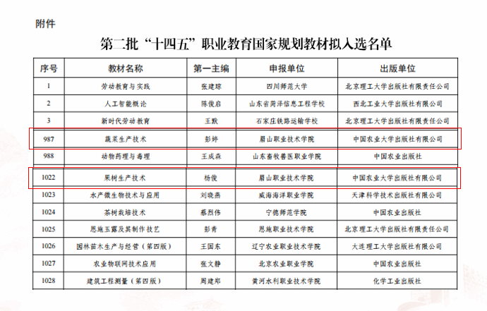 近日,教育部公布拟入选第二批“十四五”职业教育国家规划教材,我校现代农业学院《果树生产技术》《蔬菜生产技术》2本教材入选第二批“十四五”职业教育国家规划教材。