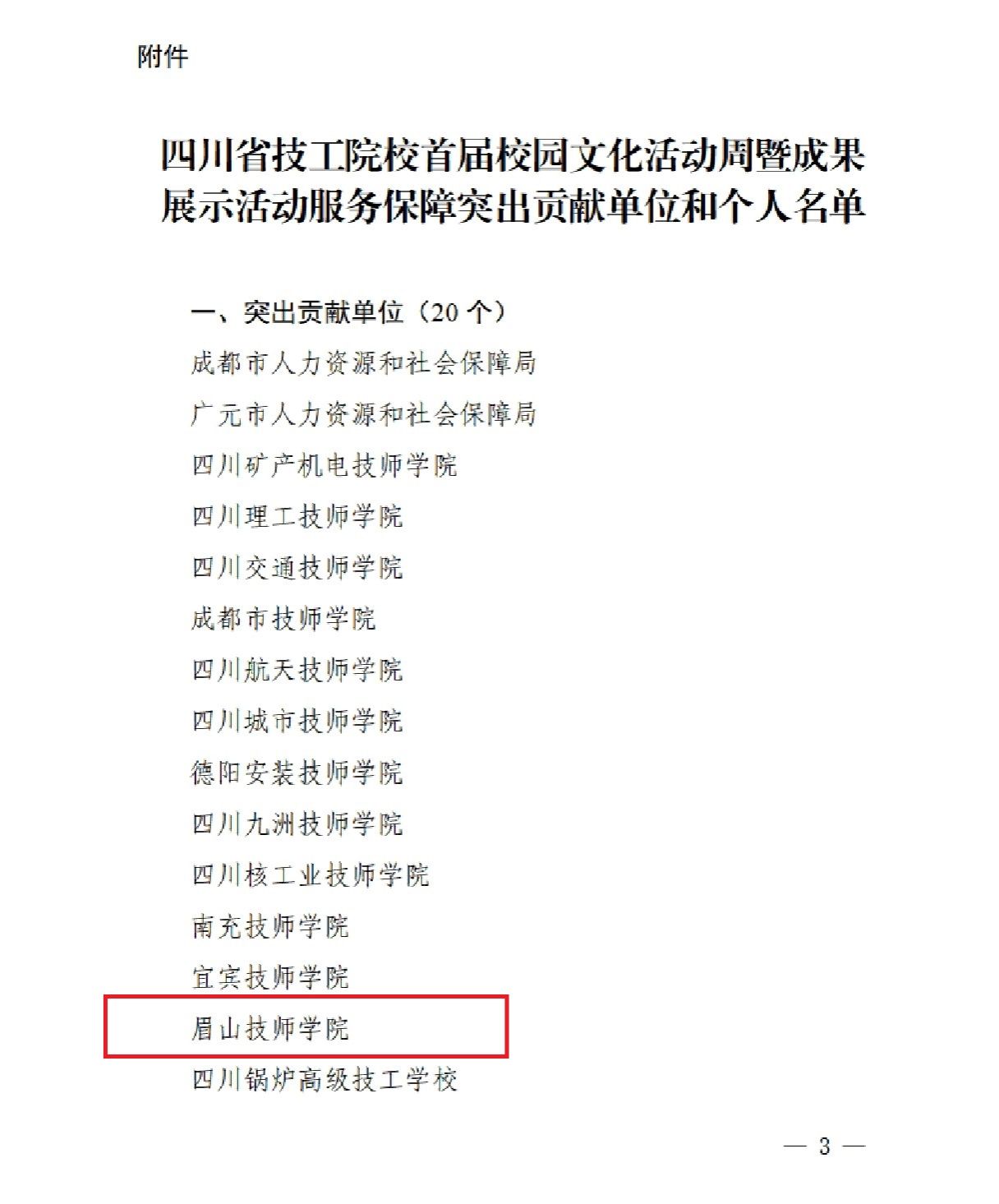 近日,四川省人力资源和社会保障厅印发通报,对全省技工院校首届校园文化活动周暨成果展示活动中的突出贡献单位予以表扬,眉山技师学院凭借在活动中的优异组织表现与显著成效,成功斩获“突出贡献单位”荣誉称号。该荣誉在全省范围内仅授予20家单位,涵盖市州人社局及技工院校。