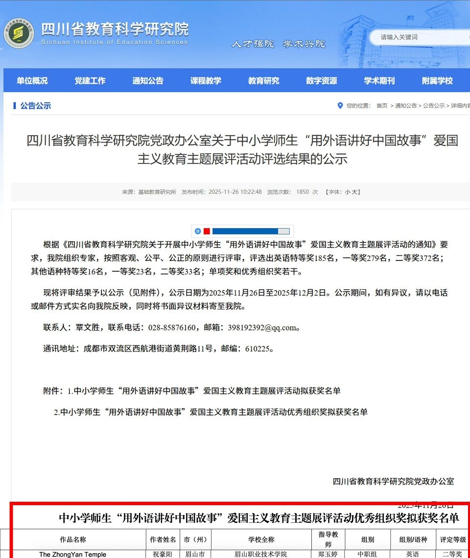 近日,四川省中小学师生“用外语讲好中国故事”爱国主义教育主题展评活动结果正式公布,技师教育学院(中职部)祝豪阳同学凭借作品《The ZhongYan Temple》(中岩寺)脱颖而出,获得省级二等奖。