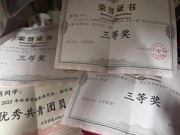 黄子芮曾在2022年12月获商贸旅游系“巾帼心向党,奋进新征程”演讲比赛三等奖,2023年1月获眉山职业技术学院优秀共青团员称号,2023年3月获商贸旅游系职业规划大赛三等奖,2024年1月,获评商贸旅游系“优秀志愿者”称号。