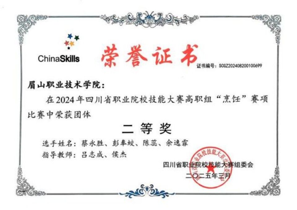 竞技场上,蔡永胜更是大放异彩。在备战全国职业院校技能大赛期间,他和队友们每天训练超过十小时。有一次,为了调试一道创新菜的酱汁配方,他们连续试验了三十多次才找到最佳配比。“那一刻的喜悦,比任何奖项都让人激动。”最终,他们捧回了全国职业院校技能大赛餐饮赛道团体金奖的奖杯。从省级比赛的二等奖到国家级大赛的金奖,从创新创业大赛到演讲比赛的舞台,他不断突破自我,用实力证明:职教学子同样能在更广阔的天地中绽放光彩。