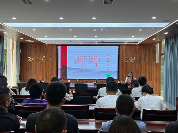董芝艳以《读红色诗词,悟辉煌党史》为题,从诗词写作背景、文学表现手法两方面对毛泽东主席所作《忆秦娥·娄山关》进行了深刻细致的解读,向党员同志们展示了红军长征途中经历的娄山关战役,带领党员们领略了伟大的长征精神,为党员们带来了一堂生动的党史学习教育课。