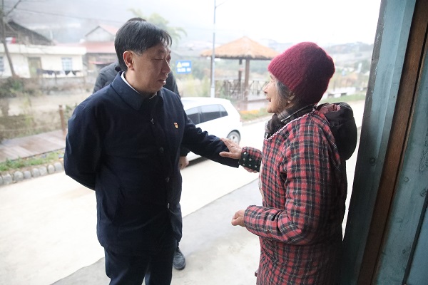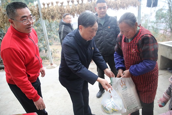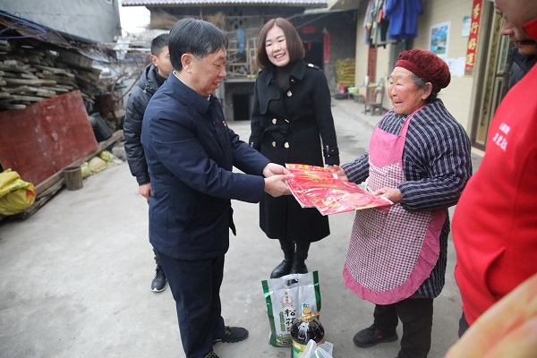 代贤军一行来到草坪村老党员、脱贫户、退居二线村组干部、致富带头人家中,为他们送去米、面、油等物品,并为他们贴上春节对联。代贤军与他们叙聊家常,详细了解他们的家庭情况和需求,同时积极宣传讲解巩固拓展脱贫攻坚成果与乡村振兴有效衔接的相关政策,鼓励他们保持乐观向上的生活态度,增强战胜困难的信心和勇气,充分利用自身优势和资源,实现乡村振兴、人民富裕。
