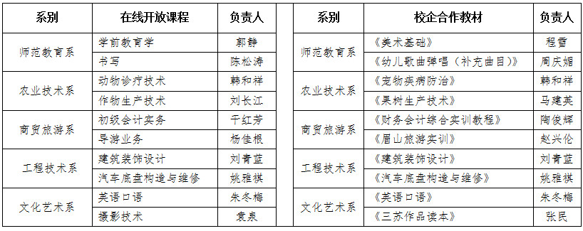 校企合作教材建设工作整体情况较好,全校共10本校企合作教材均已完成初稿,部分教材已印刷成册并投入使用,其中比较突出的如文化艺术系的《三苏作品读本》,该教材充分融入了眉山地方文化,内容上有特色、有创新,目前已编写完成并进行了第一轮试用,同时在总结试用效果的基础上又制定了下一轮优化方案,为教材的公开出版打下了良好基础;商贸旅游系《财务会计综合实训教程》基于项目化理念进行教材开发,注重学生技能的培养,在试用过程中取得了较好的效果;师范教育系《幼儿歌曲弹唱(补充曲目)》教材也已完成初稿,正安排进行首轮试用,为下一步教材的优化做足准备;工程技术系《建筑装饰设计》、《汽车底盘构造与维修》两本教材的编写则与对应的在线开放课程建设融为一体,共建共享,注重教材的实用性,思路较好。