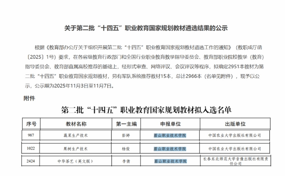 11月3日,教育部职业教育与成人教育司发布了第二批“十四五”职业教育国家规划教材遴选结果的公示。我校现代农业学院教师彭婷主编的《蔬菜生产技术》、杨俊主编的《果树生产技术》、旅游与财贸学院教师李倩主编的《中华茶艺(英文版)》被拟认定为第二批“十四五”职业教育国家规划教材书目。