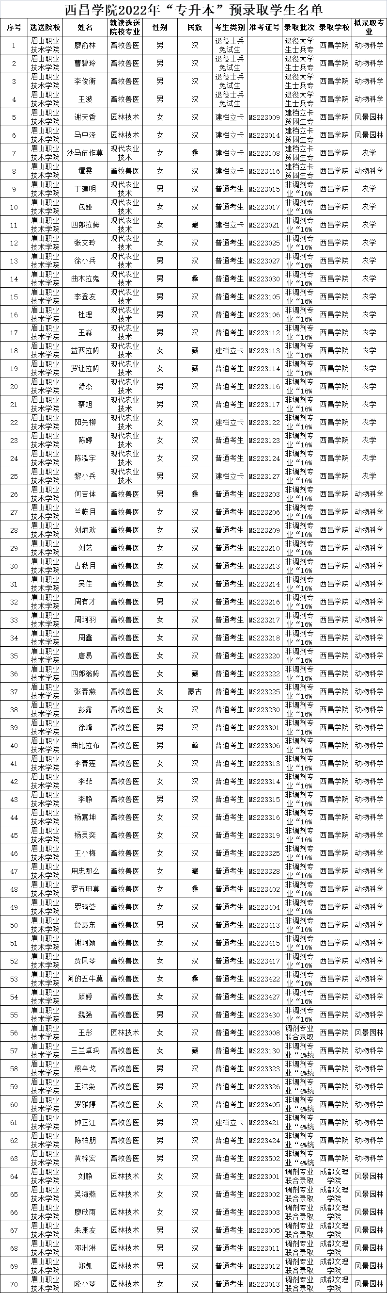 根据《四川省教育厅四川省退役军人事务厅﹐四川省人民政府征兵办公室关于做好2022年普通高等学校专升本考试招生工作的通知》(川教函〔2022)100号)、《四川省教育考试院关于做好我省2022年普通高等学校专升本考试报名和考试工作的通知》(川教考院函(2022〕6号)和《西昌学院2020年“专升本”工作实施意见》要求,现将我校2022年对口西昌学院跨校“专升本”录取情况进行公示,公示期:5月16日—5月20日。