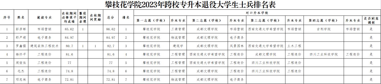 根据《四川省教育厅关于做好我省2023年普通高等学校专升本考试招生工作的通知》(川教函〔2023〕4号)、《四川省教育考试院关于做好我省2023年普通高等学校专升本报名和考试工作的通知》(川教考院〔2023〕7号)和《攀枝花学院2023年“专升本”招生简章》文件精神,学校专升本办公室按文件要求对攀枝花学院 2023年跨校 “专升本”退役大学生士兵进行排名。现将经排名结果予以公示,公示时间2023年3月27日-3月31日(五个工作日)。