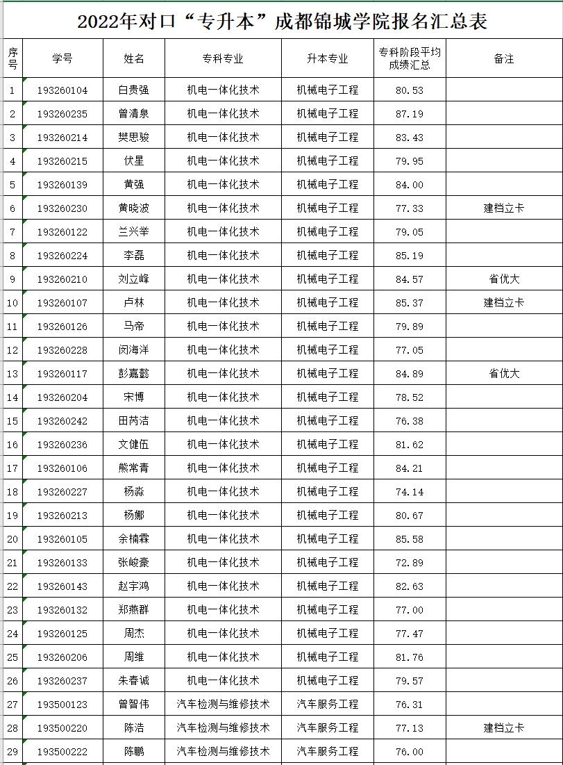 根据《四川省教育厅 四川省退役军人事务厅 四川省人民政府征兵办公室关于做好2022年普通高等学校专升本考试招生工作的通知》(川教函〔2022〕100号)、《四川省教育考试院关于做好我省2022年普通高等学校专升本考试报名和考试工作的通知》(川教考院函〔2022〕6号)和《成都锦城学院2022年专升本招生简章》文件精神,学校专升本办公室按文件要求组织开展2022届毕业生专升本报名工作。现将经我校初审通过的“专升本”报名学生予以公示,公示时间2022年3月28日-4月1日(五个工作日)。