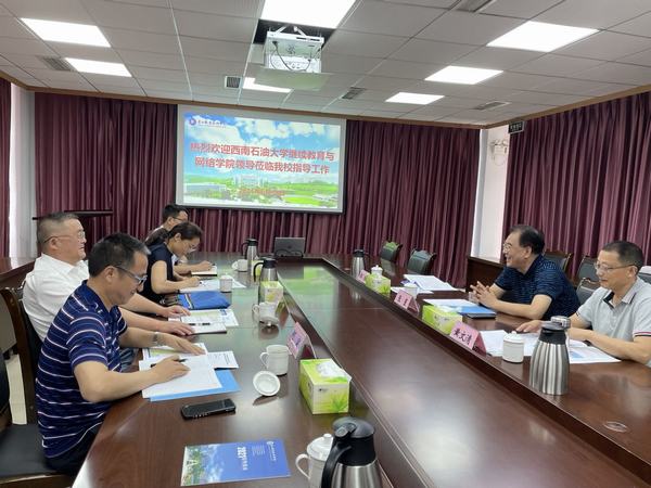 2021年6月18日西南石油大学继续教育学院院长汤富荣、副院长阮雪梅、自考学习服务中心教师陈冬、何定到我校就应用型自考合作事宜进行了洽谈。