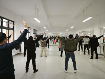接下来,胡岚老师带领学员感受传统养生——八段锦。胡老师详细讲解了每个动作的要领和功效,学员们在落地镜前对照标准姿势不断练习,胡老师穿梭指导,规范学员动作。
