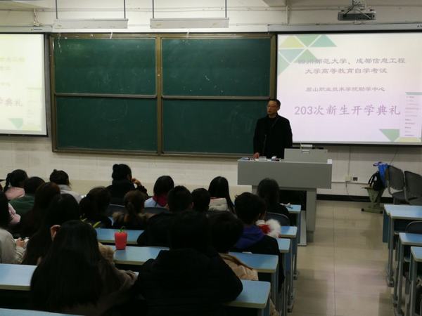 四川师范大学、成都信息工程大学眉山学习中心自考负责人郭琼老师对全体新生进行了高等教育自学考试的特点、学习方式、考试方式、学籍管理等进行了培训。