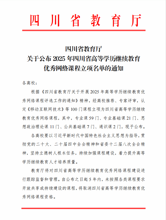 近日,四川省教育厅公布2025年四川省高等学历继续教育优秀网络课程立项名单,学校《企业财务会计》《食品理化检测技术》《西餐制作(双语版)》等三门课程获立项。