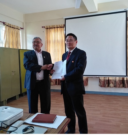 农林大学副校长Ishwari Prasad Dhakal对徐井万一行访问农林大学表示了热烈的欢迎,规划处主管Arjun Kumar Shrestha介绍了农林大学的基本情况,徐井万向对方介绍了眉山和眉山职业技术学院的基本情况。双方就两校教师层面的合作研究和访学交流,学生层面的交流项目等领域进行了交流探讨,并达成了共识,徐井万代表学院与农林大学副校长Ishwari Prasad Dhakal签订了两校合作框架协议。