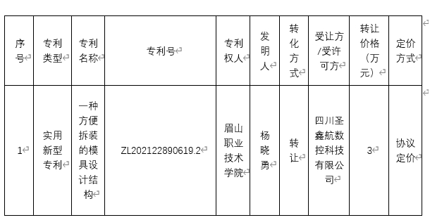 根据《中华人民共和国促进科技成果转化法》和学校《科技成果转化管理办法( 2023 年修订)》(眉职委〔2023〕45号)相关规定,现拟将我校以下科技成果转化有关事项予以公示: