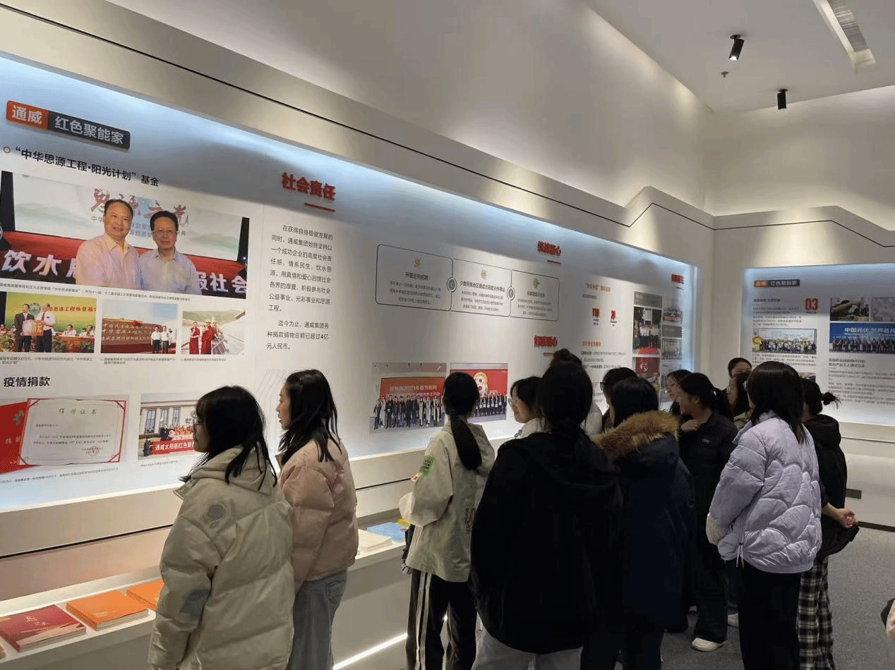 活动伊始,在讲解员的带领下参观了通威太阳能公司的党建文化展厅,了解党员先锋事迹、企业党委如何以党建为引领将红色基因融入新能源产业发展及成果。然后,党员教师还结合关于“推动绿色发展,促进人与自然和谐共生”的重要论述,为学生解读了通威太阳能公司在助力“双碳”目标中的责任担当,让学生在了解产业前沿的同时,深化对党的理论方针政策的理解与认同。