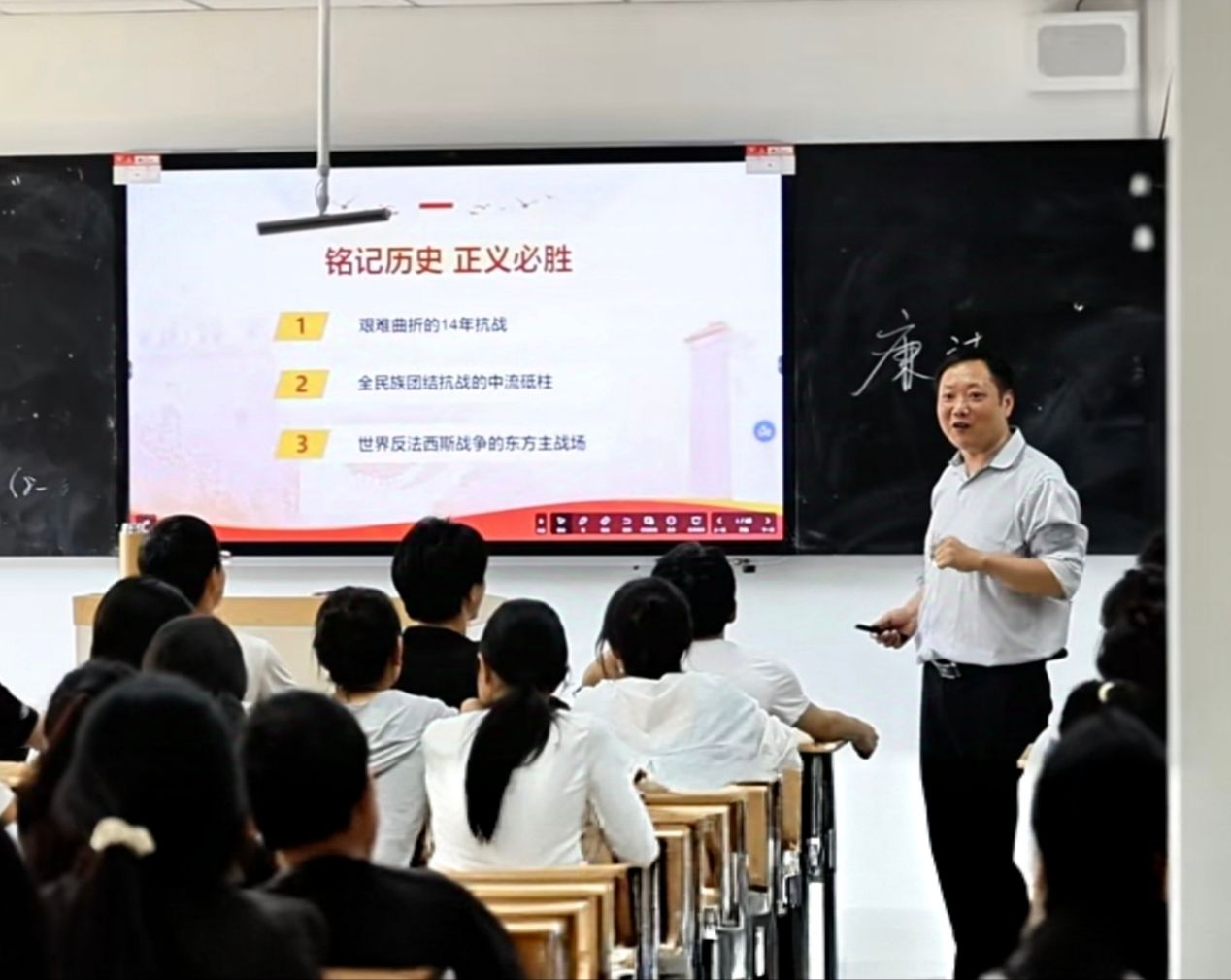 课堂上,教师们结合学生专业特点,利用详实的案例数据和丰富的课堂活动,从铭记抗战历史、领略抗战意义、领悟抗战精神、感悟抗战力量四个方面开展教学,引导同学们坚定理想信念、厚植家国情怀、无惧困难挑战、勇于奋斗奉献,把感动化为新学期里前行的强大动力,踏实学习,增长才干,努力成长为中国特色社会主义建设的栋梁之才。