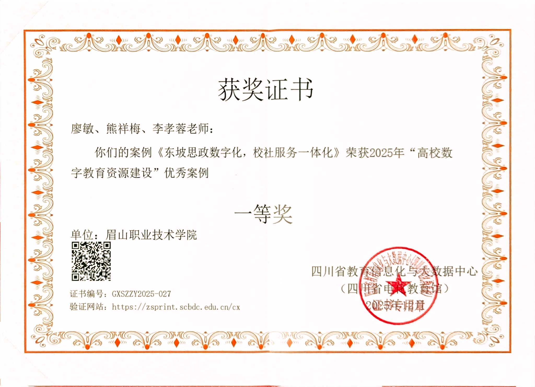 近日,由四川省教育信息化与大数据中心主办的2025年“高校数字教育资源建设”优秀案例评选结果出炉。马克思主义学院依托思政虚拟仿真教学资源开发的案例《东坡思政数字化,校社服务一体化》荣获一等奖。