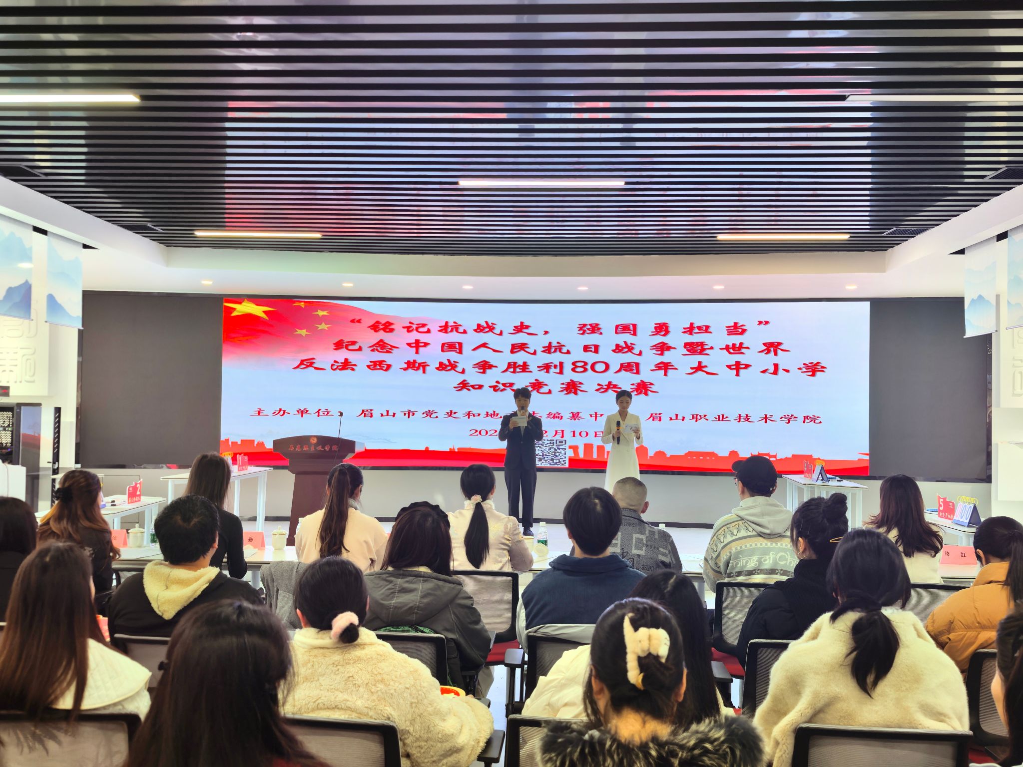为深入学习宣传贯彻习近平总书记在纪念中国人民抗日战争暨世界反法西斯战争胜利80周年大会上的讲话精神,充分发挥四川省大中小学思想政治教育一体化基地的育人作用,12月10日,我校与眉山市党史和地方志编纂中心联合举办的“铭记抗战史强国勇担当——纪念中国人民抗日战争暨世界反法西斯战争胜利80周年大中小学知识竞赛”决赛在我校虚拟仿真教育基地圆满落幕。学校组织人事部部长、马克思主义学院党总支书记、院长廖敏和眉山市党史和方志馆负责人涂燕勤出席活动,来自眉山市第一小学、东湖小学、苏辙中学和我校的100余名师生代表参加活动。