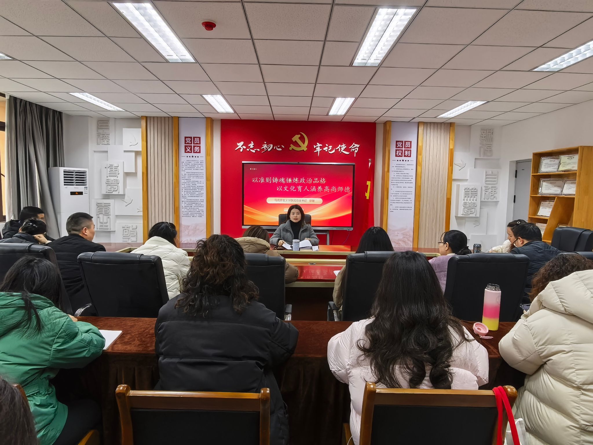 12月24日,学校组织人事部(党委教师工作部)部长、马克思主义学院党总支书记、院长廖敏以《以准则铸魂锤炼政治品格,以文化育人涵养高尚师德》为题在第七教学楼303讲授专题党课。