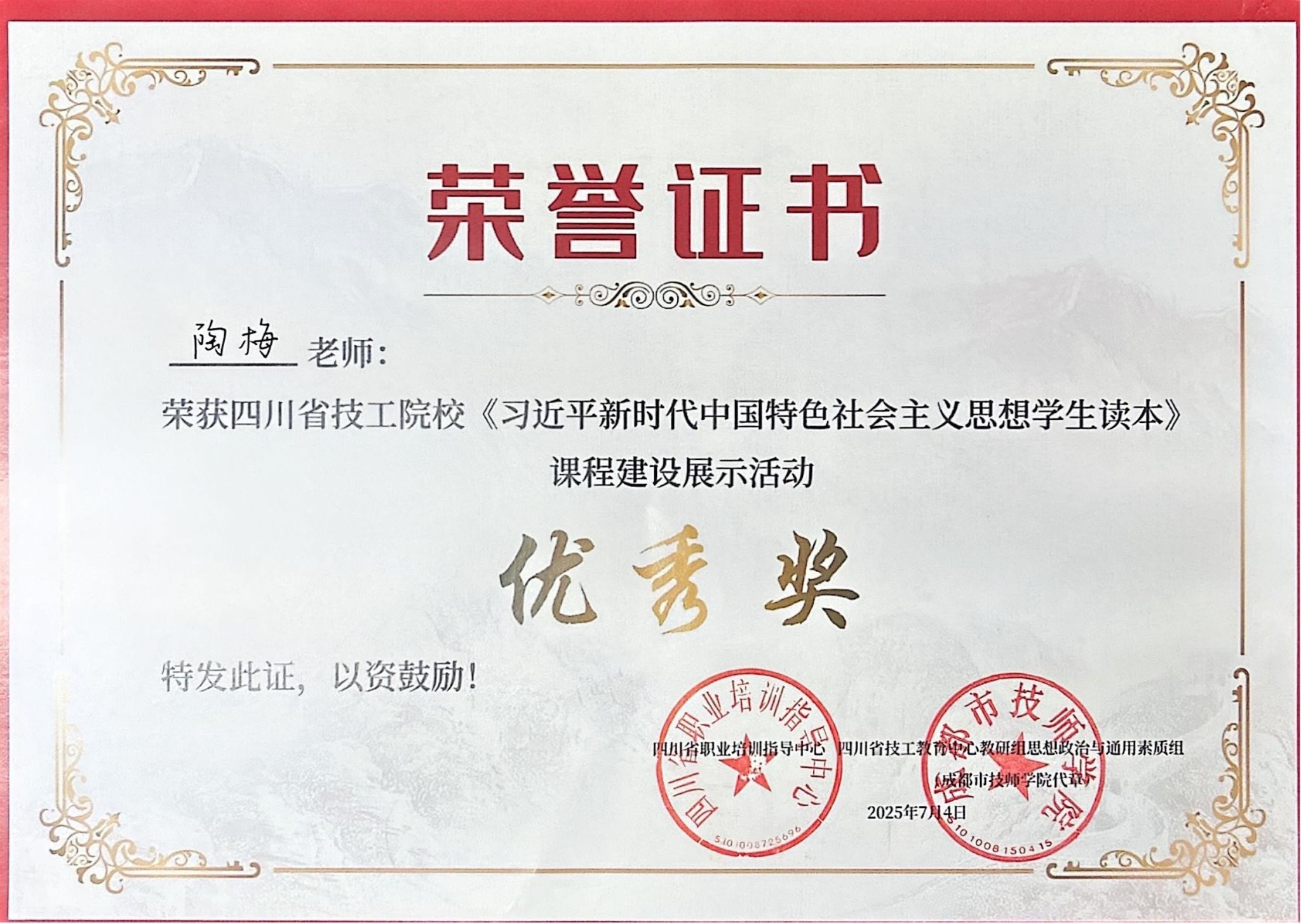 近日,四川省技工院校《习近平新时代中国特色社会主义思想学生读本》课程建设展示活动落幕,我院青年教师陶梅获优秀奖。