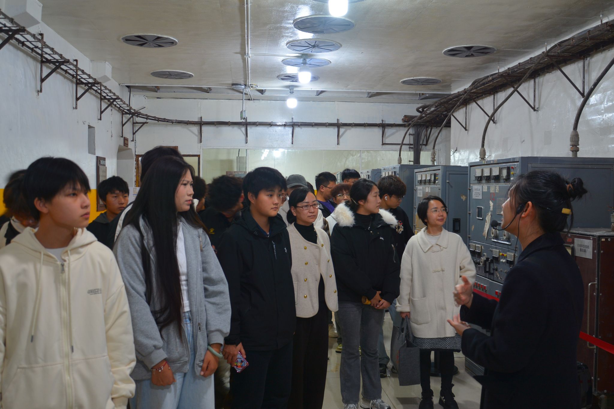 实践参观环节,在讲解员的引导下,同学们先后走进战备通信博物馆、地下坑道、核心机房,逐一参观了各个时期的通信设备与设施。讲解员结合“半部电台”开创红色通信事业的革命故事,以及三线建设时期电信人“以雪霜为伴、以坑道为家”的奋斗经历,生动讲述了老一辈通信工作者在物资匮乏、环境恶劣的条件下,坚守岗位保障通信畅通的感人事迹。当听到“无论风雨雷电,故障就是命令”的电信人精神时,同学们纷纷驻足凝视,深切体会到“嘀嗒、嘀嗒”的电波背后,是电信人对党的绝对忠诚与对使命的坚定担当。